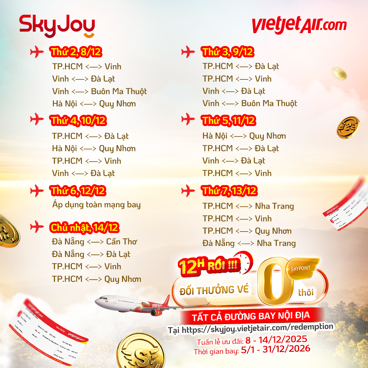 Vô vàn vé máy bay Vietjet chỉ từ 0 SkyPoint trên nhiều chặng bay nội địa hấp dẫn đang chờ Hội viên Vietjet SkyJoy!