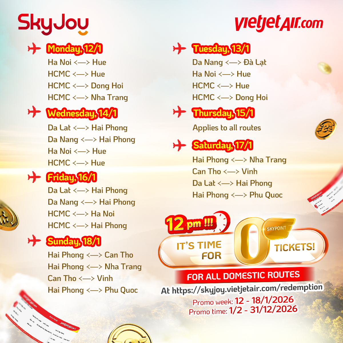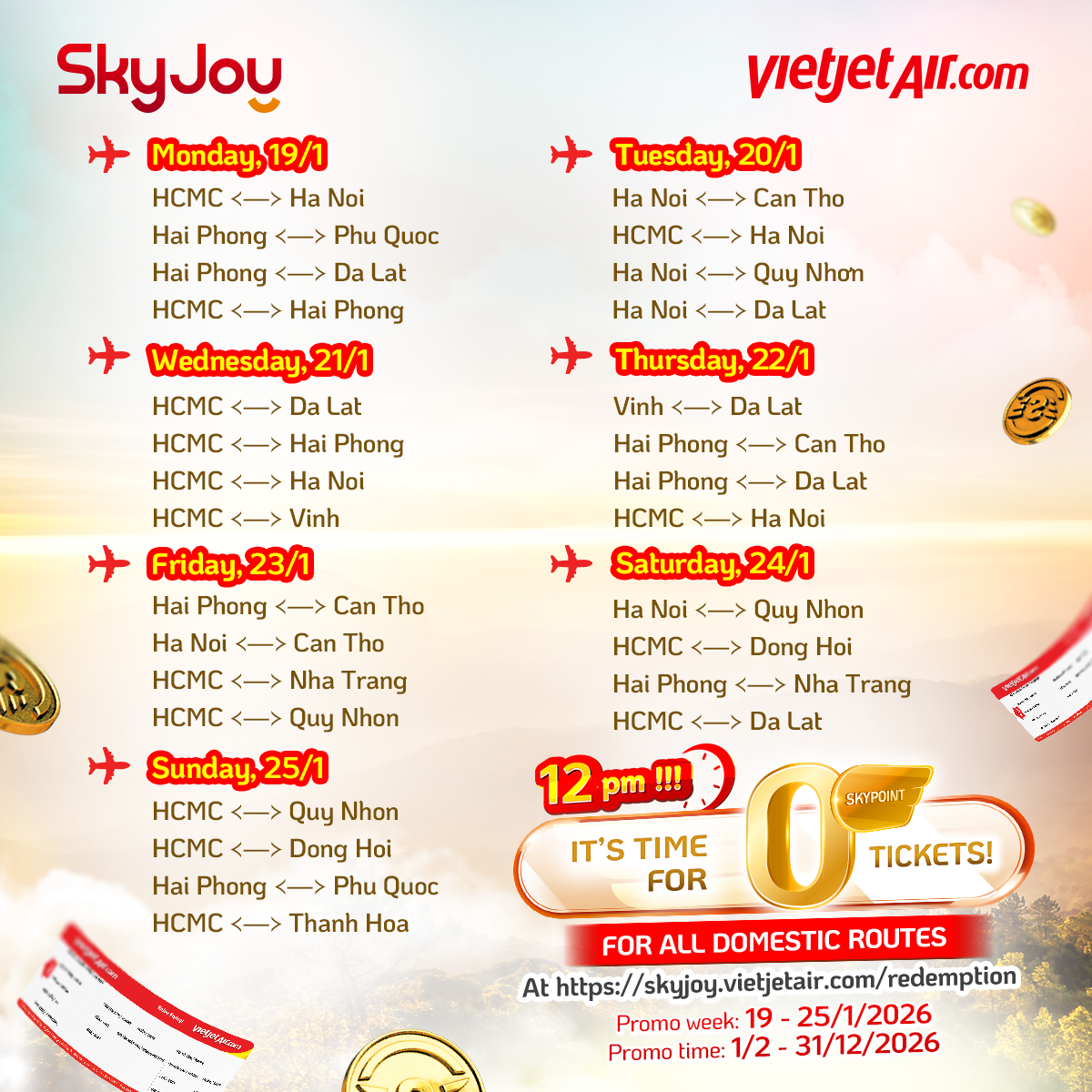 Countless Vietjet flight tickets from just 0 SkyPoint on many attractive domestic flights are waiting for Vietjet SkyJoy members!