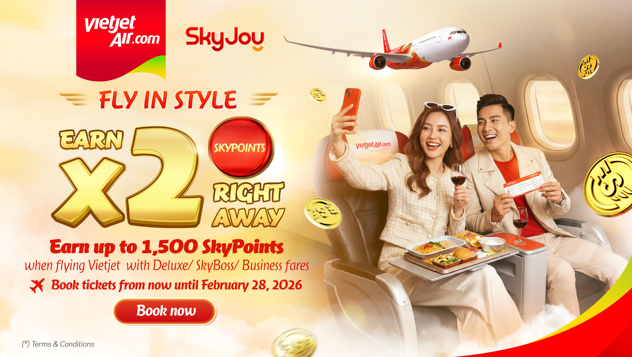 – SkyJoy members will earn SkyPoints when flying with Vietjet on Deluxe, SkyBoss, or Business fare types.
