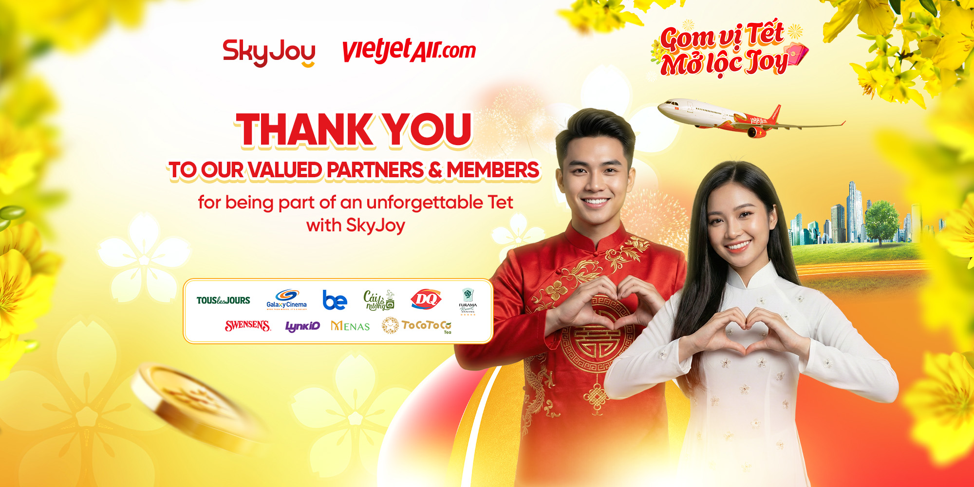 – Vietjet Promo Code: Upon winning, members will immediately receive a Voucher containing a Vietjet Promo Code, and SkyJoy will send a notification to the member via the SkyJoy app. Members may review the details of the Vietjet Promo Code under “Vouchers” in the “My Rewards” section on the SkyJoy app, or in the “My Rewards” of the “Taste of Tet – Burst of Joy” program.