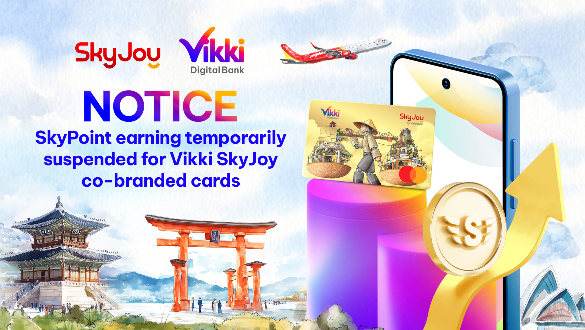 From October 10, 2025, SkyPoint earning for Vikki SkyJoy co-branded cards (Debit/Credit) will be temporarily paused for system upgrades and data synchronization.
