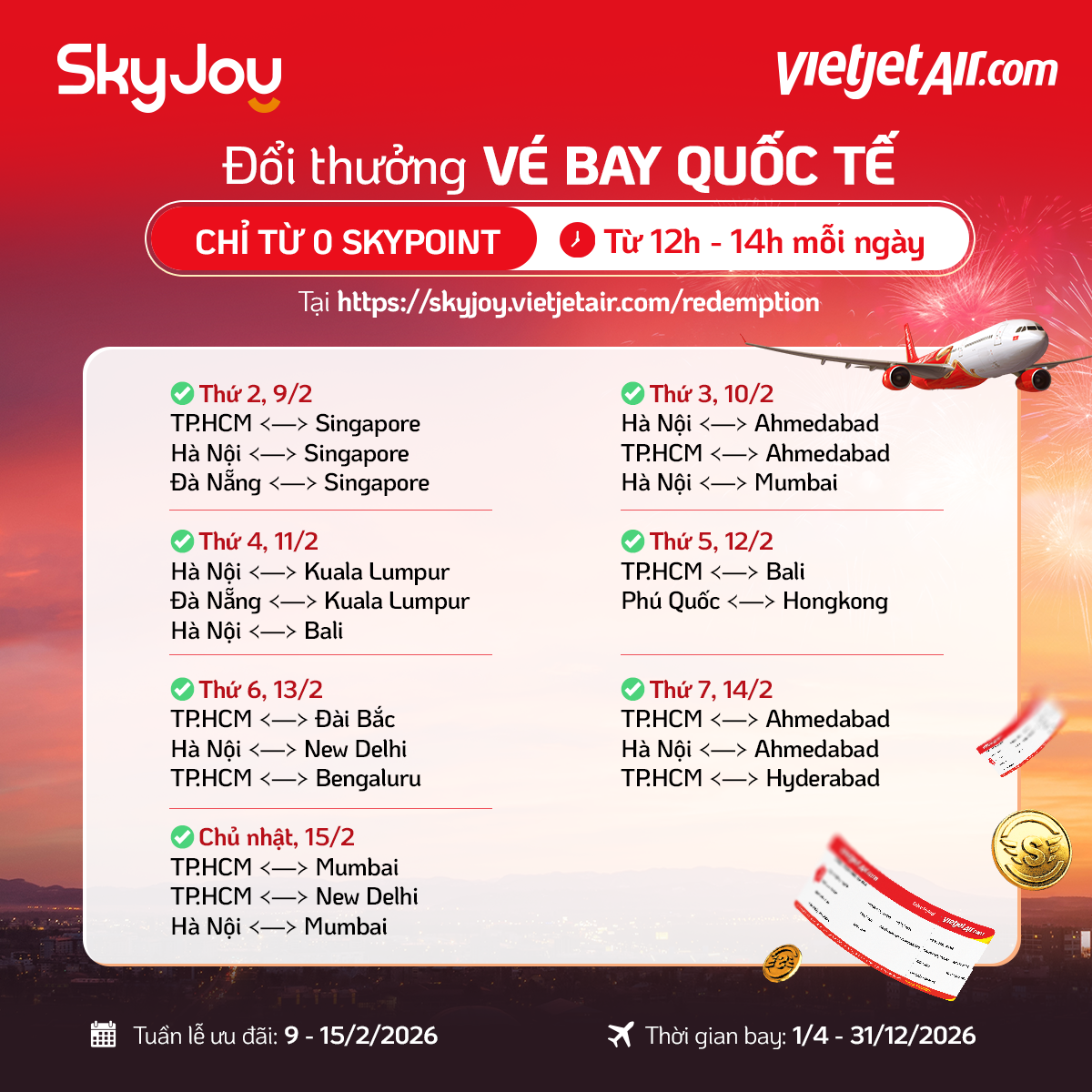 Đổi thưởng vé máy bay Vietjet bằng điểm SkyPoint